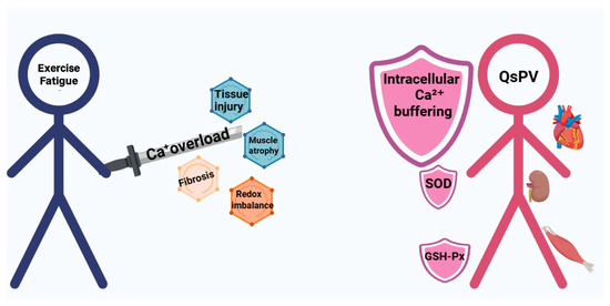 Exhaustive exercise leads to calcium overload, mitochondrial dysfunction, and increased reactive oxygen species (ROS) production. These stress responses promote the activation of calcium-dependent proteases (calpain-1/2) and the upregulation of muscle atrophy-related genes (MuRF-1, MAFbx-32), resulting in impaired contractility and tissue damage. QsPV buffers intracellular Ca2+, thereby stabilizing mitochondrial function and reducing ROS generation. This cascade attenuates oxidative stress and suppresses proteolytic and atrophic signaling, ultimately preserving muscle structure and improving systemic endurance. The protective effects of QsPV extend beyond skeletal muscle to cardiac and renal tissues, indicating a multi-organ protective mechanism against exercise-induced fatigue.