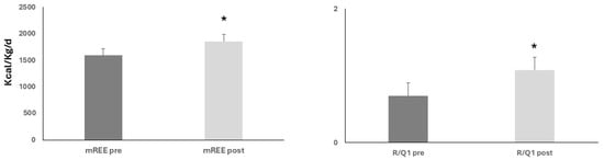 Upon nutritional and rehabilitation interventions, baseline resting energy expenditure (mREE) and respiratory quotient (R/Q1) showed a significant rise; ANOVA, both * p < 0.05.