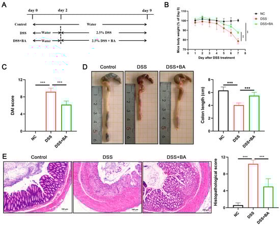 Eight-week-old male C57BL/6J mice (25 ± 1 g) obtained from Changsheng Biotechnology Co., Ltd. (Benxi, China), were used in this study. All experimental procedures were conducted in compliance with animal welfare guidelines and approved by the Animal Ethics Committee of Dalian Medical University (Approval No. AEE23106). A total of 15 mice were chosen according to the Sample Size Calculation for Animal Studies Using Degrees of Freedom (E). The animals were housed in polycarbonate cages with hardwood chips, where the temperature (23 ± 1 °C), lighting conditions (12 h light/dark cycle), and humidity (40–60%) were strictly controlled. The animals had free access to a standard diet and water ad libitum. After adapting for a week, the mice were randomly divided into three groups (n = 5 per group): a control group, which received standard drinking water for 9 days; a DSS group, which received drinking water for 2 days, followed by the administration of 2.5% DSS (w/v) in drinking water for 7 days; and a DSS + BA group, which was treated identically to the DSS group but with additional daily oral administration of BA (30 mg/kg [14]), as shown in Figure 1A. The DAI was evaluated on day 9 using a previously described method [17]. Following euthanasia via CO2 inhalation, colons were excised, measured, and processed for H&E staining. Histopathological scoring (0–4) was evaluated based on epithelial surface erosion, crypt architecture distortion, and immune cell infiltration [18].