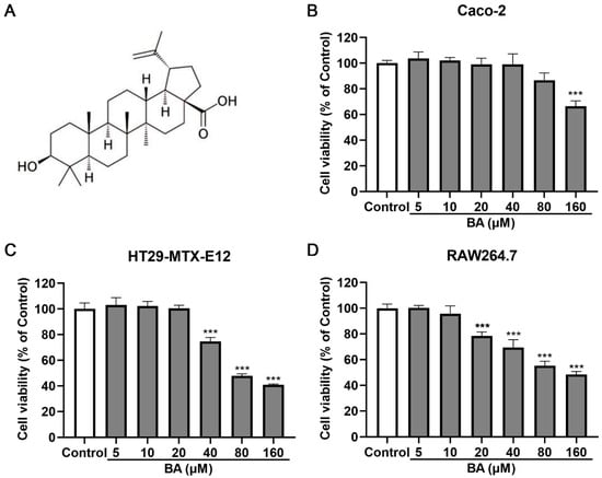 Cytotoxicity of BA on IEC and macrophage viability. (A) BA chemical structure. (B–D) Caco-2, HT29-MTX-E12, and RAW264.7 cells were treated with BA (0–160 μM). Cell viability was assessed using CCK-8 assay at 24 h. n = 3, *** p < 0.001.