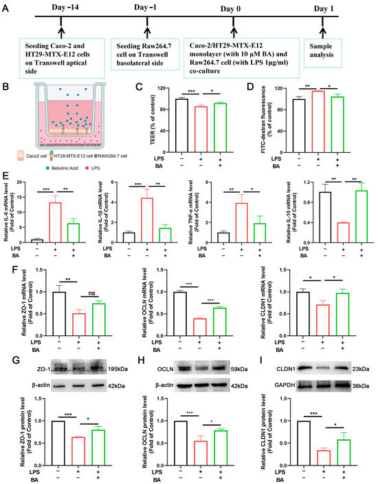 BA restores IEB integrity, decreases inflammation, and enhances TJ protein expression in the cell monolayer. (A) Schematic overview of study design in cell monolayer model. (B) Co-culture configuration: Caco-2/HT29-MTX-E12 on the apical side, RAW264.7 on the basolateral side. (C) Transepithelial electrical resistance (TEER). (D) Paracellular flux (FITC-dextran). (E) IL-6, IL-1β, IL-10, and TNF-α mRNA expression. (F) ZO-1, OCLN, and CLDN1 mRNA expression. (G–I) ZO-1, OCLN, and CLDN1 protein bands and relative expression. n = 3, * p < 0.05, ** p < 0.01, *** p < 0.001, ns: not significant.