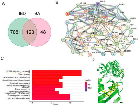 BA engages with PPAR-γ signaling pathway based on network pharmacology and MOD. (A) Venn diagram. (B) PPI network. (C) KEGG. (D) MOD.