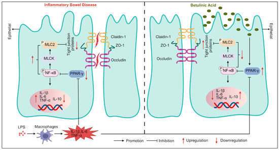 In summary, this study established two in vitro models to explore the role of BA in the treatment of IBD from the perspective of the intestinal barrier. BA regulates PPAR-γ levels, inhibits NF-κB activation and MLCK expression, suppresses MLC2 phosphorylation, reduces inflammation, and enhances tight junction expression, thereby treating IBD. This may contribute to the development of new therapies for IBD (Figure 7).