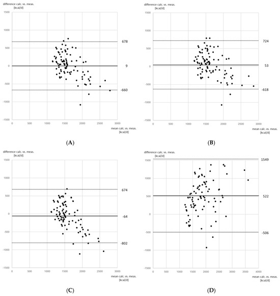 Bland−Altman plots for agreement between indirect calorimetry and calculation of energy expenditure using different reference weights. (A) Indirect calorimetry versus adjusted body weight calculated using 18% of excess body weight; (B) indirect calorimetry versus adjusted body weight calculated using 25% of excess body weight; (C) indirect calorimetry versus ideal body weight; (D) indirect calorimetry versus total body weight. For the calculation of energy expenditure by reference weight, 24 kcal/kg/d were used. The solid line depicts bias, the dotted lines depict the limits of agreement as 1.96 × standard deviation of the difference between both methods. Bias and limits of agreement are given as kcal/d.