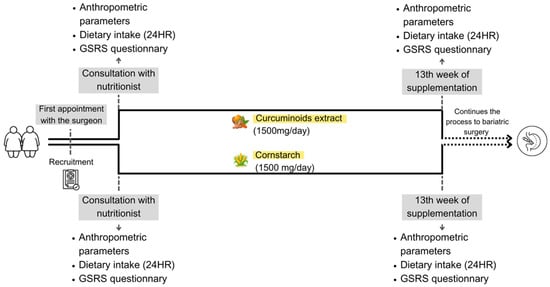 At their first appointment with the hospital’s registered dietitian, participants underwent assessments of anthropometric parameters, dietary intake, and gastrointestinal symptoms. Following these evaluations, they were provided with the assigned supplement for 13 weeks. Since curcumin presents low bioavailability and is fat-soluble [17], patients were instructed to take three capsules after lunch and dinner, meals with a higher fat content. Each capsule contained 250 mg of curcumin, totaling six capsules per day (1500 mg/day).