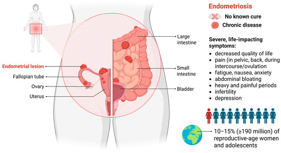 Endometriosis is a benign, chronic, hormone-dependent disease characterized by endometrium-like tissue appearance outside the uterine cavity. It affects 10–15% (≥190 million) of reproductive-age women and adolescents [1,2,3,4] and produces a range of diverse symptoms. The most common ones are painful periods and pelvic pain not associated with menstruation, which are experienced by approximately 70% of women [2], and infertility, which occurs in 30–50% of women [3], ultimately leading to a decreased quality of life. The foci of endometriosis can be located in the ovaries (endometrioid cysts) or peritoneum, or they may deeply infiltrate pelvic tissues, often causing bowel and bladder dysfunction (Figure 1) [1,3].