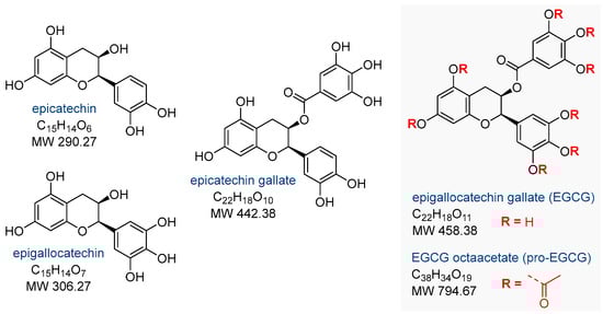 The structure of the four main catechins from green tea and the peracetylated prodrug of epigallocatechin gallate (pro-EGCG).