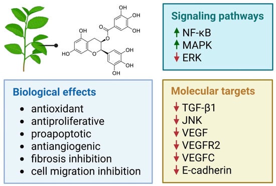 Selected signaling pathways and molecular targets modulated by epigallocatechin gallate, eliciting specific biological effects relevant to the potential treatment of endometriosis. Green arrows—stimulating activity, red arrows—inhibitory activity.