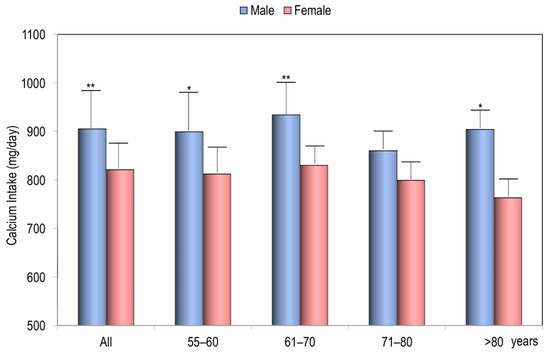 Calcium intake in all males and females and according to the decade of age. * p < 0.05, ** p < 0.01 for Student’s t-test of males vs. females.