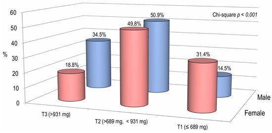 Figure 2 illustrates the percentage of male and female subjects categorized by tertiles of calcium intake. The prevalence in the lower tertile of calcium intake was significantly higher in females than in males (31.4% vs. 14.5%, respectively). Instead, in the highest tertile of calcium intake, the prevalence of males was significantly higher than that of females (34.5% versus 18.8%, respectively) (Figure 2).