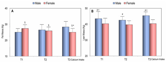 Fat mass (A) and lean mass (B) in males and females according to the tertiles of calcium intake. * p < 0.05 for Student’s t-test of males vs. females; § p < 0.05 for ANOVA test according to the calcium intake tertiles in females; # p < 0.05 for ANOVA test according to the calcium intake tertiles in males.