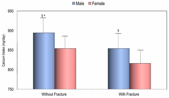 Calcium intake in males and females according to history of fractures. * p < 0.05 for Student’s t-test of males vs. females; § p < 0.05 for Student’s t-test without fractures vs. with fractures.