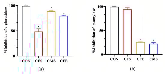 In vitro antidiabetic evaluation. (a) Inhibition activity of α-glucosidase. (b) Inhibition activity of α-amylase. CON, acarbose; CFS, cell-free supernatant of SA9; CMS, cell metabolite supernatant of SA9; CFE, cell-free extract of SA9. Data were expressed as mean ± SEM. * p < 0.05 was regarded as significantly different compared with the CON group.