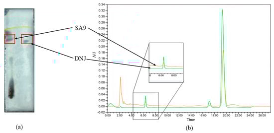 Determination of the suspected active substance DNJ in the fermentation supernatant of SA9. (a) TLC. (b) HPLC.