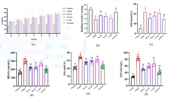 Coagulation of W. coagulans stops T2DM from worsening (n = 8). (a) Weight. (b) Urinary output. (c) Fasting blood glucose. (d) HbAlc. (e) INS. (f) LPS. Control, normal group; T2DM, diabetes model; H-SA9, 109 CFU/day of SA9; M-SA9, 108 CFU/day of SA9; L-SA9, 107 CFU/day of SA9. Data were expressed as mean ± SEM. * p < 0.05 was regarded as significantly different compared with the Control group, and # p < 0.05 was regarded as significantly different compared with the T2DM group.