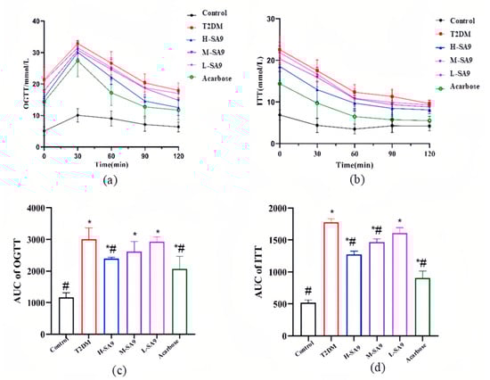 SA9 improves glucose tolerance levels in mice (n = 8). (a) OGTT. (b) ITT. (c) AUC of OGTT. (d) AUC of ITT. Control, normal group; T2DM, diabetes model; H-SA9, 109 CFU/day of SA9; M-SA9, 108 CFU/day of SA9; L-SA9, 107 CFU/day of SA9. Data were expressed as mean ± SEM. * p < 0.05 was regarded as significantly different compared with the Control group, and # p < 0.05 was regarded as significantly different compared with the T2DM group.