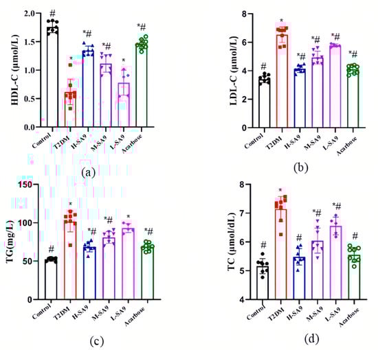 Effect of SA9 on lipid tetrads in db/db mice (n = 8). (a) HDL-C. (b) LDL-C. (c) TG. (d) TC. Control, normal group; T2DM, diabetes model; H-SA9, 109 CFU/day of SA9; M-SA9, 108 CFU/day of SA9; L-SA9, 107 CFU/day of SA9. Data were expressed as mean ± SEM. * p < 0.05 was regarded as significantly different compared with the Control group, and # p < 0.05 was regarded as significantly different compared with the T2DM group.