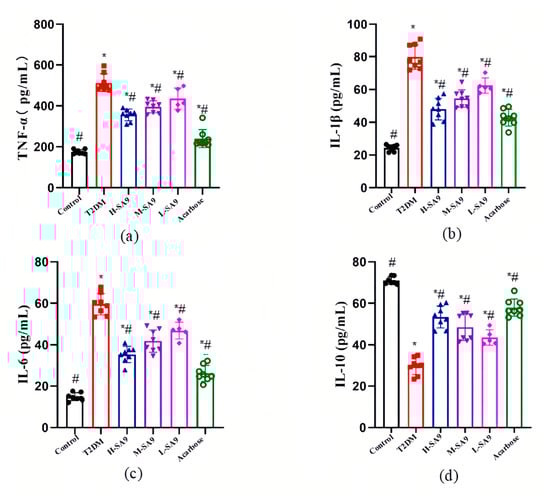 Effects of W. coagulans SA9 on inflammation-related factors in the db/db mouse model of T2DM (n = 8). (a) TNF-α. (b) IL-1β. (c) IL-6. (d) IL-10. Control, normal group; T2DM, diabetes model; H-SA9, 109 CFU/day of SA9; M-SA9, 108 CFU/day of SA9; L-SA9, 107 CFU/day of SA9. Data were expressed as mean ± SEM. * p < 0.05 was regarded as significantly different compared with the Control group, and # p < 0.05 was regarded as significantly different compared with the T2DM group.