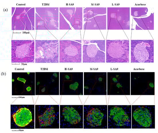 Protective effect of W. coagulans SA9 on pancreatic islets (n = 6). (a) HE-stained section of the pancreas of db/db mice (400×). (b) IF-stained section of the pancreas of db/db mouse (400×). Insulin-positive cells are stained red, glucagon-positive cells are stained green, and nuclei are stained blue. Control, normal group; T2DM, diabetes model; H-SA9, 109 CFU/day of SA9; M-SA9, 108 CFU/day of SA9; L-SA9, 107 CFU/day of SA9.