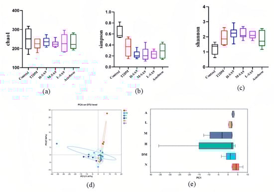 Effect of W. coagulans SA9 on the structure of intestinal microorganisms (n = 6). (a) Chao1. (b) Simpson. (c) Shannoon. (d) PCoA. (e) Boxplot. Control, normal group; T2DM, diabetes model; H-SA9, 109 CFU/day of SA9; M-SA9, 108 CFU/day of SA9; L-SA9, and 107 CFU/day of SA9. Data were expressed as mean ± SEM.