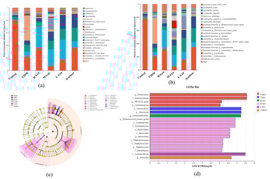 The gut microbiota plays a pivotal role in metabolic regulation and is closely associated with the pathogenesis of diabetes and obesity []. In this study, we investigated the effects of W. coagulans SA9 on the composition and structure of the intestinal flora of db/db mice. In Alpha Diversity, we used Chao1, Simpson and Shannon index indices to assess species diversity (Figure 8a–c), and found that the Simpson index of the probiotic group decreased significantly but not statistically significant (p < 0.05) indicating that SA9 has a limited effect on gut microbial diversity. Regarding beta diversity (Figure 8d,e), principal coordinate analysis (PCoA) revealed substantial differences in microbial community structure between the probiotic M-SA9 and T2DM groups. The microbial community structure of the probiotic L-SA9 and the acarbose groups was similar to that of the T2DM group. To elucidate microbiota-mediated mechanisms, we analyzed the gut communities of the Control, T2DM, high-dose SA9 (H-SA9), medium-dose SA9 (M-SA9), and low-dose SA9 (L-SA9) groups. At both the genus and species levels, the relative abundance of Limosilactobacillus reuteri was significantly elevated in probiotic-treated mice. LefSe cladograms (Figure 9a) and LDA bar plots (Figure 9b) highlighted distinct signature taxa: Aerococcaceae/Aerococcus in the T2DM group; Limosilactobacillus in H-SA9; multiple taxa including Lachnospiraceae, Bacteroidota, and Staphylococcus in M-SA9; Lactobacillaceae in L-SA9; and Firmicutes in the acarbose group. These findings suggest that W. coagulans SA9 alleviates diabetic phenotypes by reshaping the intestinal microbiota.
