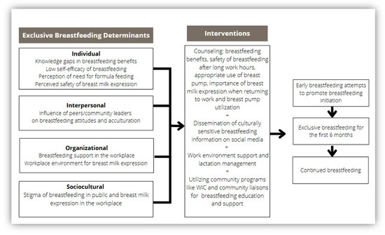 We used the themes from the FGDs to develop a framework [28] for breastfeeding interventions that address breastfeeding determinants at various levels of the socio-ecological model [47] (Figure 3). The interventions suggested in Figure 3 address the knowledge gap on breastfeeding benefits, safety of expressed breast milk, using culturally sensitive audiovisuals for disseminating breastfeeding education, accessing lactation support at work, and leveraging the influence of community leaders/peers for education and support. According to this new framework, breastfeeding retention is influenced by individual attributes such as a mother’s understanding of the safety and benefits of breast milk, confidence in her ability to adequately feed the baby with breast milk alone, and the impact of acculturation on formula-feeding decisions. Further, perceptions of breast pump safety and utilization influence the practice of breast milk expression after returning to work. Interpersonal factors include influences from peers, family members, and community members regarding breastfeeding. Finally, the framework includes larger organizational and sociocultural factors that affect access to lactation services and support, as well as social norms related to breastfeeding. Public health advocates should consider multi-level constructs to provide targeted breastfeeding interventions and promote policies that support breastfeeding in the workplace, reducing stigma of public breastfeeding and use of donor breast milk, and fear of breast milk expression in workplaces.