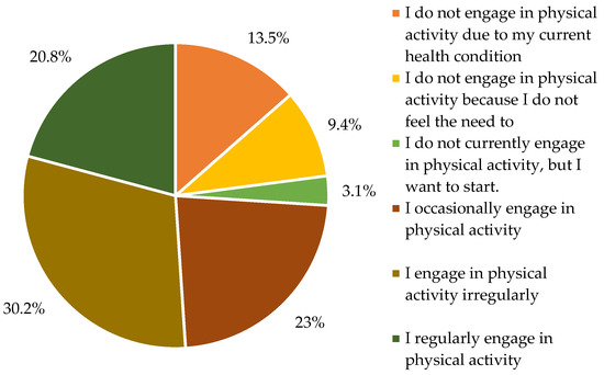 Regarding physical activity, 20.8% of respondents reported regular participation, 22.9% engaged occasionally, and 30.2% participated irregularly. Meanwhile, 26% of seniors stated that they did not engage in any physical activity. The most frequently cited barrier was current health conditions, followed by lack of motivation, limited access to senior-specific programs, financial constraints, and lack of time (Figure 2).