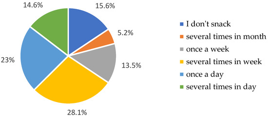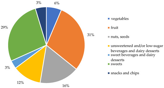 In response to the question regarding dietary practices, 87.5% of participants indicated that they were not following any specific diet. At the same time, 12.5% declared adherence to dietary regimes, such as diabetic, light/low-residue diets, intermittent fasting, or meal plan subscriptions. Regarding meal frequency, most older adults reported consuming three meals per day. However, only 18.8% indicated regular meal timing, while 55.5% followed a partially consistent schedule, as summarized in Table S1. The most frequently reported setting for eating meals was the home (Figure S2). As shown in Supplementary Figure S2, most meals were consumed at home, indicating a preference for domestic eating environments. When asked about snacking between meals, the responses ranked as follows: several times per week > several times per day > once daily > once per week or not at all (Figure 4). Among the most commonly chosen snack groups were sweet snacks > fruits > nuts > unsweetened/lightly sweetened dairy beverages and desserts > vegetables > salty snacks > sweetened beverages and milk-based desserts (Figure 5 and Figure S1). Figure 5 illustrates that sweet snacks were the most frequently chosen, followed by fruits and nuts. Supplementary Figure S3 provides a detailed frequency breakdown for other snack categories.