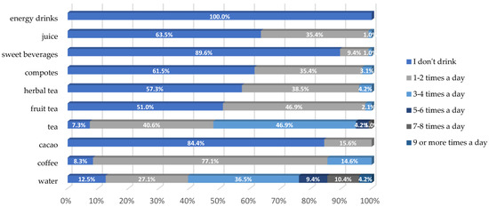 The survey also revealed that older adult respondents do not consume energy drinks, in contrast to younger individuals, who report high consumption levels of such beverages. Additionally, more than half of the older participants indicated that they do not sweeten their drinks. Among the preferred beverages selected by seniors were water, coffee, and tea (Figure 6).