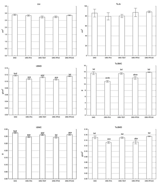 DXA parameters (area, BMC, and BMD) of the total skeleton (Ts) and isolated tibia (t). Explanation: a vs. SHO; b vs. ORX-PhS; c vs. ORX-TEST; d vs. ORX-PP50; and e vs. ORX-PP150.