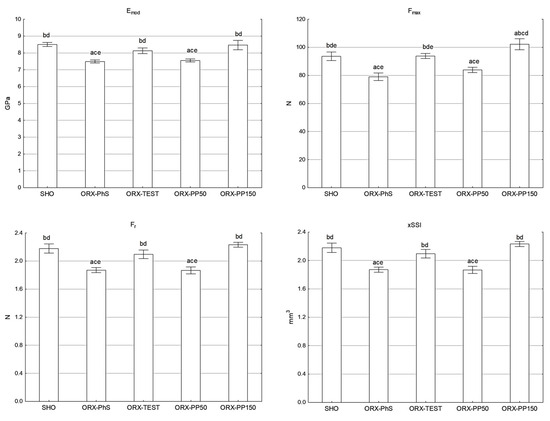 Maximal force (Fmax), the Young’s modulus of elasticity (Emod), the force of elastic limit (Fr), and pQCT (xSSI) of tibia shaft. Explanation: a vs. SHO; b vs. ORX-PhS; c vs. ORX-TEST; d vs. ORX-PP50; and e vs. ORX-PP150.