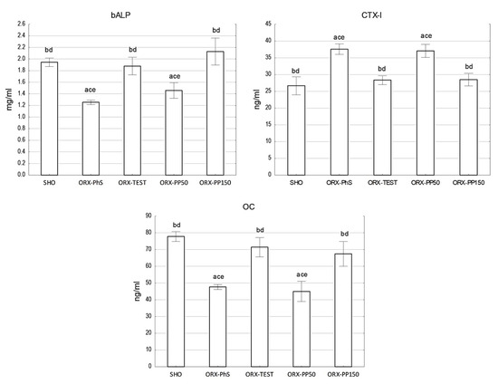 Biochemical parameters of bone tissue metabolism. Explanation: a vs. SHO; b vs. ORX-PhS; c vs. ORX-TEST; d vs. ORX-PP50; and e vs. ORX-PP150.