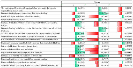 The significance level for all variables used for cluster analysis was below 0.05, indicating that the differences between clusters were statistically significant. It could be seen during the process that three variables were explicitly determinant and discriminating factors between the clusters. The three variables were positive statements about breastfeeding: “Mothers who formula feed miss one of the great joys of motherhood” (F = 212.750); “Breast milk is the ideal food for babies” (F = 214.941); “Breast milk is more easily digested than formula” (F = 209.261).