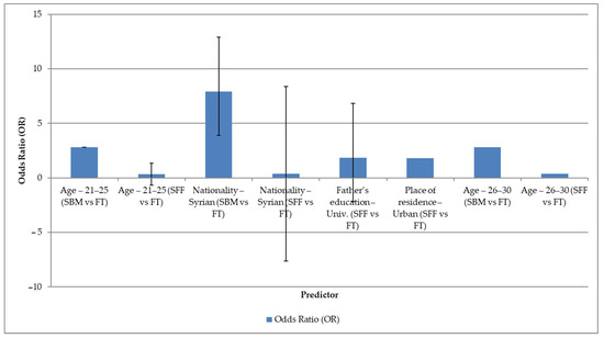 For the age groups, respondents aged 21–30 years were significantly more likely to be included in the SBM cluster compared to the FT group (OR ≈ 2.8; 95% CI: 1.07–7.36), while the same age group was rather less likely to be part of the SFF cluster (OR ≈ 0.34–0.36). Gender was found to be a strong predictor: Syrian respondents were much more likely to belong to the SBM attitude cluster compared to the FT group (OR = 7.91; 95% CI: 3.83–16. 31) but were much less likely to belong to the SFF cluster (OR = 0.39; 95% CI: 0.17–0.88).
