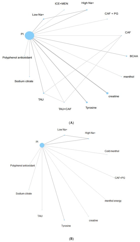 Two separate networks were constructed for the outcomes of endurance performance and subjective perception (Figure 3A,B). Each node represents a unique intervention, and the edges indicate direct comparisons. Node size reflects sample size, while edge thickness indicates the number of trials comparing the linked interventions.