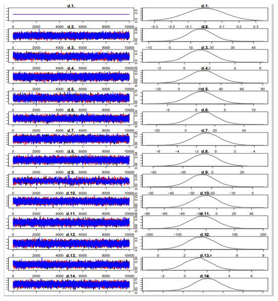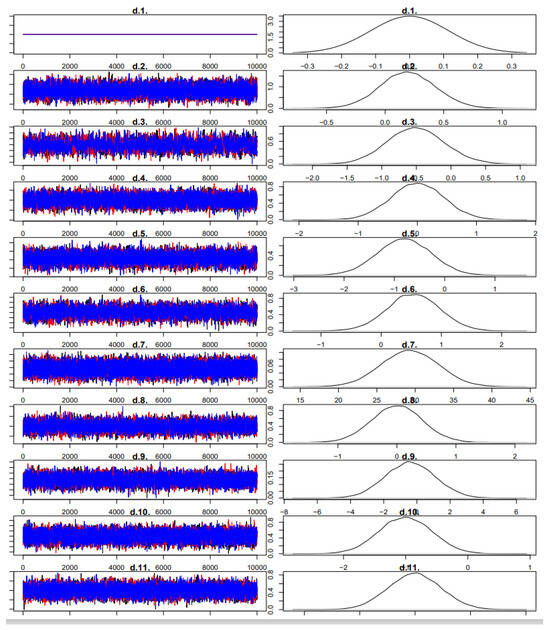 Convergence was assessed using trace plots and the potential scale reduction factor (PSRF), with values < 1.05 indicating good convergence. All parameters reached satisfactory convergence (PSRF ≈ 1.00). Detailed trace plots and model diagnostics have been provided in the Figure 4 and Figure 5).