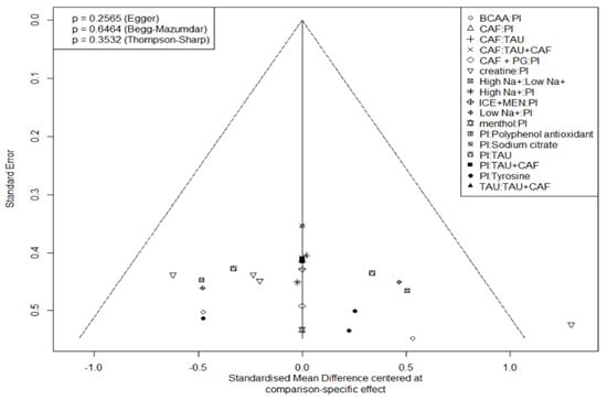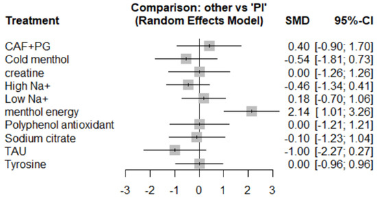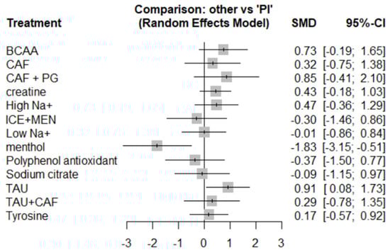 Other supplements like BCAA (SMD = 0.73), creatine (SMD = 0.43), and high-sodium (SMD = 0.47) showed positive trends but lacked statistical significance due to wide confidence intervals. ICE + Menthol and polyphenols also exhibited non-significant effects (SMDs –0.30 and –0.37, respectively). Supplements such as sodium citrate, low-sodium, tyrosine, and caffeine-based combinations (CAF, CAF + PG, TAU + CAF) showed minimal or uncertain effects (SMDs close to zero; wide CIs).