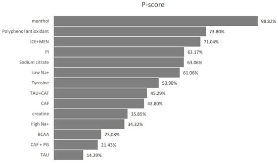 The direction of SMDs was defined such that a positive value indicates improvement for outcomes like power output or distance, and a negative value indicates improvement for outcomes where lower values are favorable, such as time-to-exhaustion. Menthol (MEN) showed a significant improvement in endurance performance (SMD = –1.83, 95% CI: –3.15 to –0.51, P-score = 98.82%), where negative SMD reflects shorter completion time (e.g., in 5 km time trials) and, thus, superior performance. Taurine (SMD = 0.91, 95% CI: 0.08 to 1.73, P-score = 14.39%) also showed statistically significant improvement. (Please refer to Figure 6, Figure 7 and Figure 8 for details).