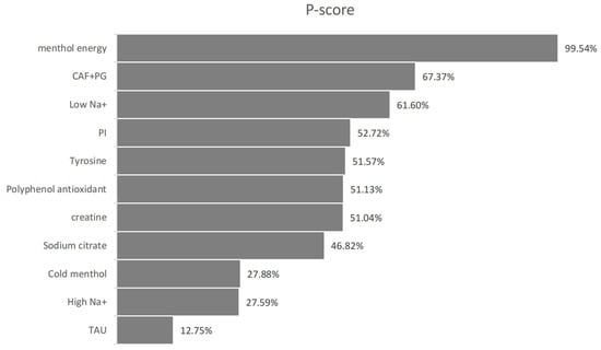 Removing small-sample studies (n < 10) or switching random-effect models did not significantly alter the key findings. Menthol (SMD = –1.83), taurine (SMD = 0.91), and menthol energy (SMD = 2.14) retained their statistical significance with consistent effect sizes and confidence intervals.