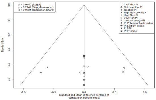 Taurine unexpectedly showed a negative trend (SMD = –1.00, 95% CI: –2.27 to 0.27), potentially due to dose variations or limited sample sizes. Creatine, tyrosine, and polyphenols all showed null effects (SMD = 0.00), suggesting their mechanisms may be less effective in thermally stressful conditions.