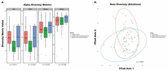 Microbial diversity in MASLD patients with and without advanced fibrosis. (A) Alpha diversity metrics (ACE, Chao1, Shannon, Simpson) measured in stool samples from three groups: healthy controls (red), MASLD patients without advanced fibrosis (green), and MASLD patients with advanced fibrosis (blue). Significant differences in ACE and Chao1 diversity indices were observed, indicating altered microbial richness in MASLD with advanced fibrosis (p = 0.011 and p = 0.014, respectively). (B) Beta diversity analysis using the Aitchison distance metric, visualized through principal coordinates analysis (PCoA), showing significant clustering of microbial communities across the groups (p = 0.001, PERMANOVA).