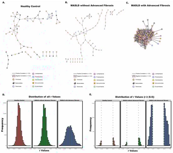 Bacterial co-occurrence interactions in MASLD patients with and without advanced fibrosis. (A–C) Co-occurrence networks showing microbial associations in (A) healthy controls, (B) MASLD patients without advanced fibrosis, and (C) MASLD patients with advanced fibrosis. Nodes represent bacterial taxa, colored by phylum, and edges represent significant correlations (r ≥ |0.5|) between taxa. (D) Distribution of all bacterial correlation (r) values in each group. (E) Distribution of correlation (r) values filtered by significant correlations (r ≥ |0.5|), highlighting differences in strong microbial associations across disease groups.