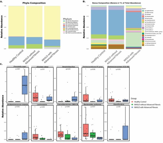 Age, gender, race, and Charlson’s Comorbidity Index were included in the multivariate analysis, of beta diversity where results confirmed that microbial profiles differed significantly between healthy controls, MASLD patients without advanced fibrosis, and MASLD patients with advanced fibrosis (p = 0.001) (Figure 1B). Together, these findings highlight that disease status and fibrosis stage are linked to distinct shifts in microbial community composition.