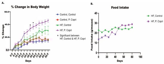 Effect of P. copri colonization on body weight and food intake in high-fat diet mice. (A) Median percent change in body weight over time with 95% confidence intervals for mice on a high-fat (HF) or control diet, with or without P. copri colonization. Mice in the HF diet group gavaged with P. copri (purple) showed significantly greater body weight gain compared to HF diet controls (green) at multiple time points (p < 0.01). (B) Average food intake (g/mouse) over time for HF diet groups. n = 8 per group.