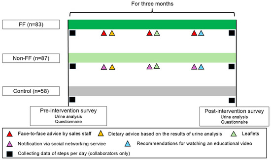 For the intervention groups (FF and Non-FF), health information was provided three times over 3 months. The first intervention involved dietary advice based on the urinalysis results, such as the appropriate salt intake. The second intervention involved providing two types of health information through leaflets (Supplemental Figure S2). The first leaflet addressed eating habits, including recommendations to limit carbohydrate and salt intake and increase dietary fiber intake. The second leaflet addressed locomotor activities, provided information on locomotive syndrome [20], and recommended increasing walking and daily activities by 10 min. The third intervention encouraged participants to watch an online video (Supplemental Video S1). In this video, a doctor in a white coat presented two cases: one where arterial fibrillation detected during a health checkup was left untreated, resulting in a stroke with residual disabilities, and another where hypertension from youth was left untreated, which led to heart failure. This video highlighted the importance of seeking prompt treatment if abnormalities are identified during health checkups. Company M produced all leaflets and videos under specialist supervision. For the FF group, leaflets and video encouragement were provided and explained by Company M sales staff. For the Non-FF group, materials were delivered via SNS. At the beginning of the interventional period, the participants were advised to install the application software provided by Company M on their smartphones to measure their daily number of steps. No health information, other than urinalysis results, was provided to the Control group.