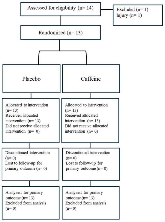 Following the familiarization session, participants were randomly assigned in a double-blind, crossover, counterbalanced design to ingest either CAF or PLA. A minimum washout period of 48 h was observed between testing sessions to ensure complete caffeine clearance and sufficient recovery. Participants were instructed to document their dietary intake during the 24 h preceding the first testing session and to replicate the same dietary pattern before the subsequent session.