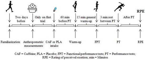To control for potential confounding factors, participants were instructed to avoid the intake of CAF, ergogenic aids (such as nitrate and sodium bicarbonate), alcohol, and anti-inflammatory medications. Moreover, they were advised to limit any high-intensity exercise during the 24 h preceding each experimental session. Additionally, they were advised to maintain consistency in nutrition and sleep.
