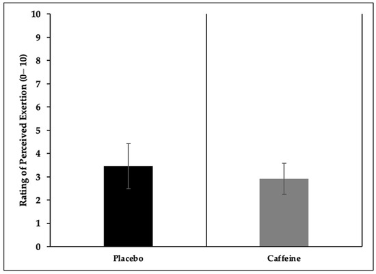 The rating of perceived exertion (RPE) did not differ significantly between conditions (p = 0.110); however, the CAF trial yielded a lower mean value (2.92 ± 0.64) than PLA (3.46 ± 0.97), with a moderate effect size (d = 0.65) (Figure 3).