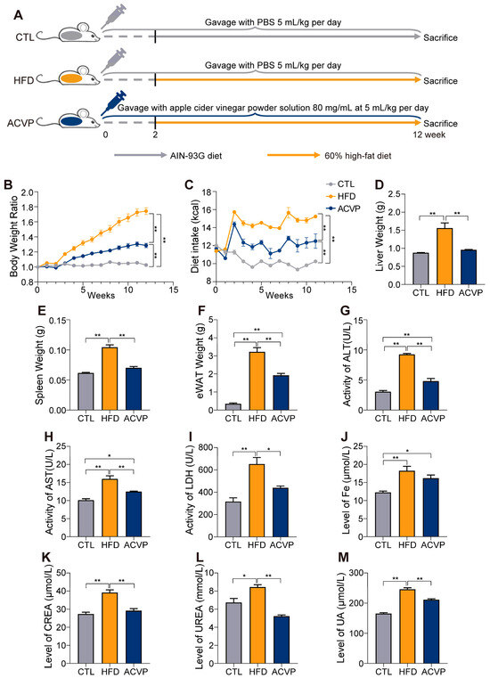 Apple cider vinegar powder (ACVP) supplementation affects the physiological status induced by high-fat diets (HFDs). (A) Schematic diagram of mouse groups, n = 6. (B) Body weight ratio and (C) dietary intake of the experiment cycle. (D) Liver weight, (E) spleen weight, and (F) epididymal white adipose tissue (eWAT) weight of the mice at the time of dissection. (G) Serum alanine aminotransferase (ALT), aspartate aminotransferase (AST) (H), lactate dehydrogenase (LDH) (I), Fe (J), creatinine (CREA) (K), urea (UREA), (L) and uric acid (UA) (M) levels in mice. Error bars represent mean ± SEM, * p < 0.05, and ** p < 0.01.