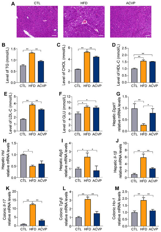 Histological analysis of liver tissue via H&E staining revealed severe microvesicular steatosis in HFD-fed mice, characterized by abundant lipid vacuoles, whereas the CTL group exhibited normal hepatic architecture. ACVP intervention markedly reduced lipid droplet accumulation, with only scattered vacuoles observed (Figure 2A). These morphological changes aligned with the serum metabolic profiles: HFD significantly elevated TG, CHOL, HDL-C, LDL-C, and GLU. ACVP supplementation reversed these alterations (Figure 2B–F). HFD-induced hepatic lipid accumulation was mechanistically linked to upregulated lipogenesis and impaired lipolysis. Quantitative PCR analysis demonstrated a significant decrease in hepatic Dgat1 transcriptional expression in the HFD group, a key enzyme in triglyceride synthesis, which was attenuated by ACVP (Figure 2G). Moreover, HFD suppressed Hsl transcriptional expression, critical for lipolysis (Figure 2H). Additionally, HFD-fed mice exhibited elevated Atg5 transcriptional expression, suggesting dysregulated autophagy, which was normalized by ACVP (Figure 2I).